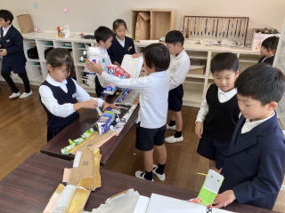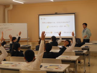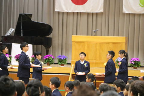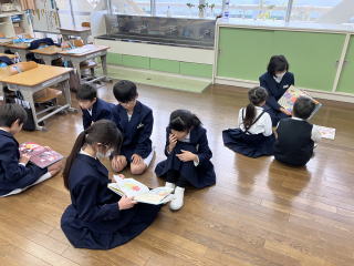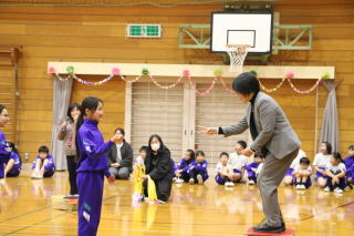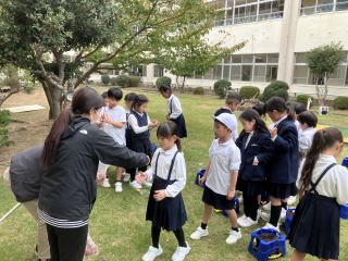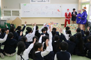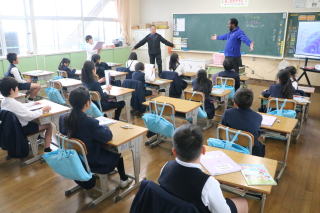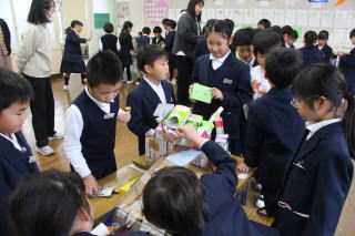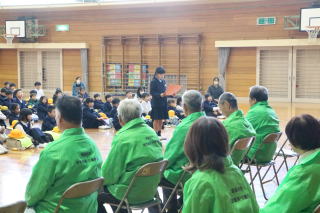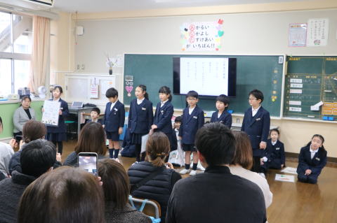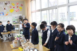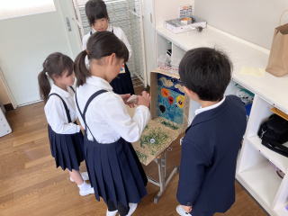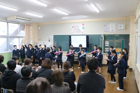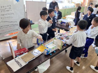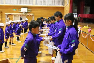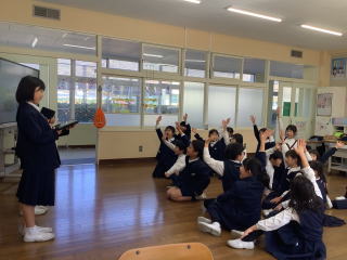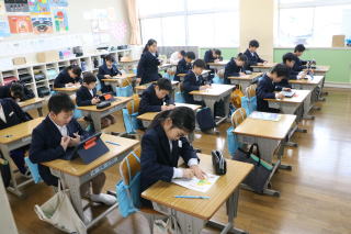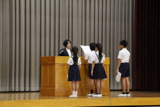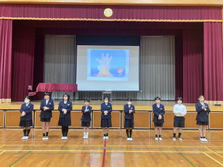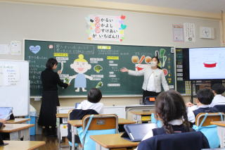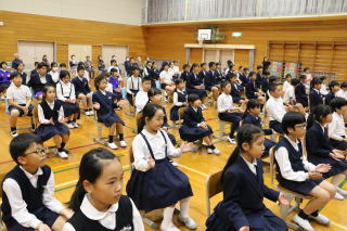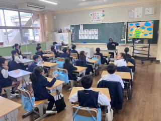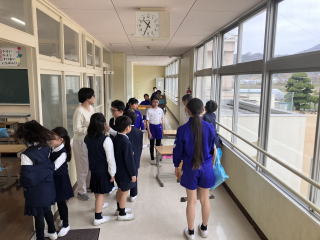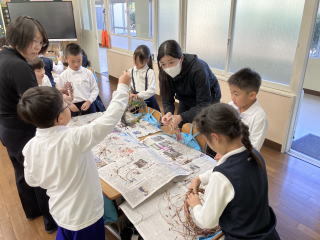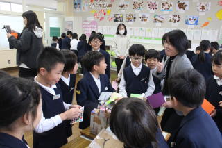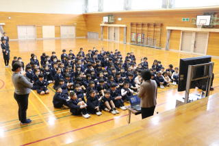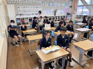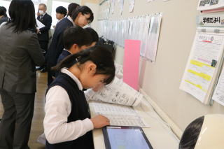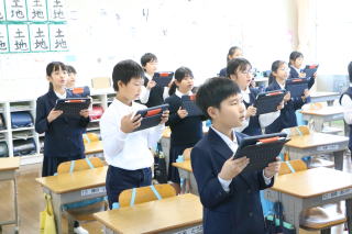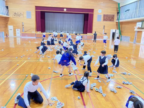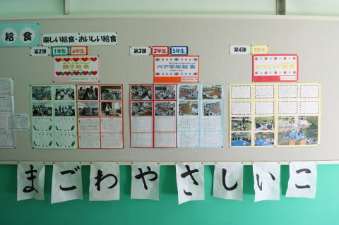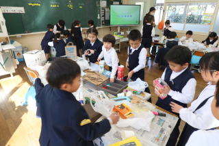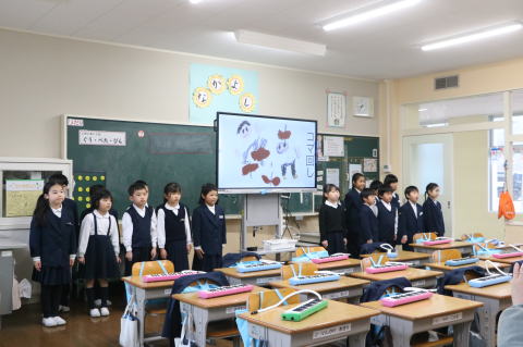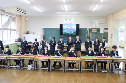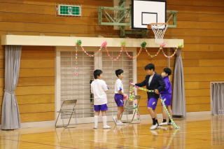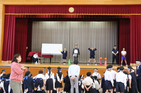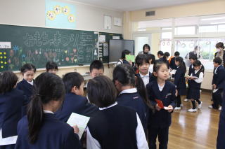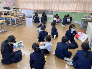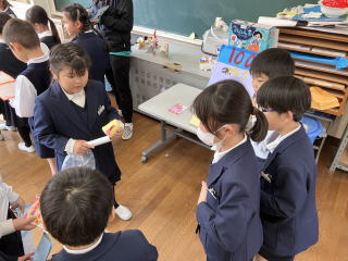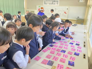3校時、児童会の主催で、新入生歓迎会がありました。1年生の自己紹介の後、色別チームのペアで、校内のスタンプラリーを行いました。各ポイントで、先生から出されたミッションをクリアしてシールもらいながら校内を巡りました。