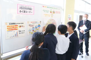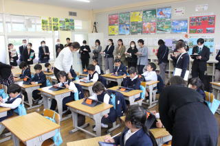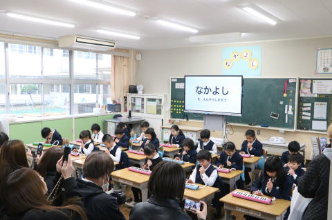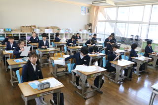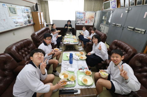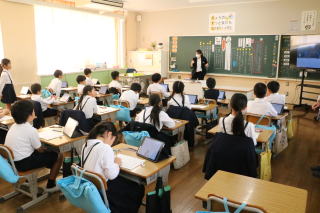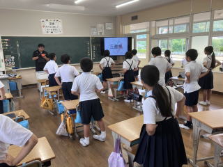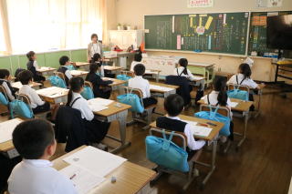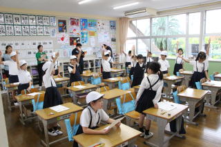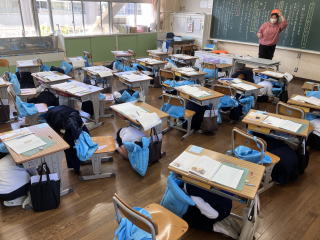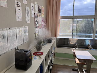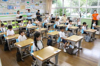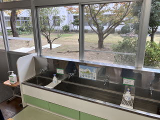 高室小学校では、文部科学省のガイドラインに沿って、県教育委員会と市教育委員会の指導のもと、徹底したコロナウィルス感染予防対策を実施しています。登下校中は間隔を開け、登校してからも学年の利用玄関を変更し、混雑を解消しました。トイレや手洗いでも間隔をとり、利用教室の消毒を徹底しています。教室は、エアコンを活用しながら効果的に窓を開けて換気を心がけています。